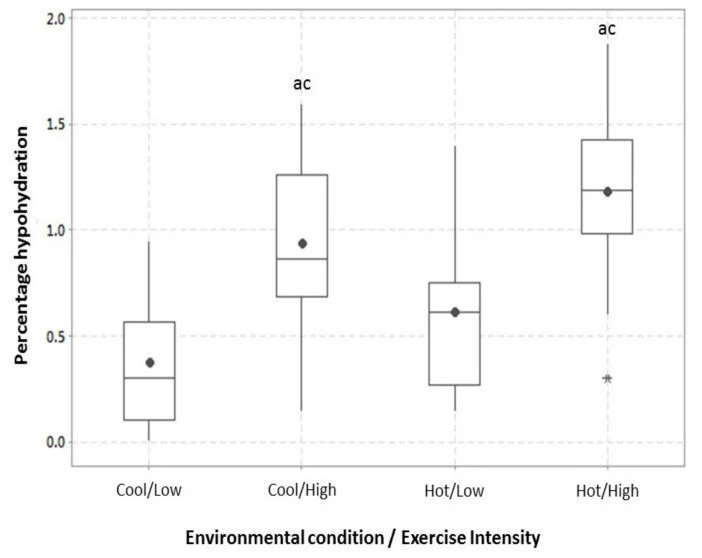Recently, a group of researchers studied the factors that affect hypohydration (dehydration) during training in elite male soccer players. They studied the difference in sweat rates, dehydration, and fluid intake during four different environmental and exercise intensity conditions: 1) cool temperature, low intensity (Cool/Low), 2) cool temperature, high intensity (Cool/High), 3) hot temperature, low intensity (Hot/Low), and 4) hot temperature, high intensity (Hot/High). The researchers discovered that environment and exercise conditions significantly affect sweat rate and dehydration, with the greatest fluid loss during the Hot/High condition. However none of the players experienced fluid loss greater than 2% body mass, the point at which hypohydration significantly impairs exercise performance. This is likely due to the increase in fluid intake that accompanied a higher sweat rate.